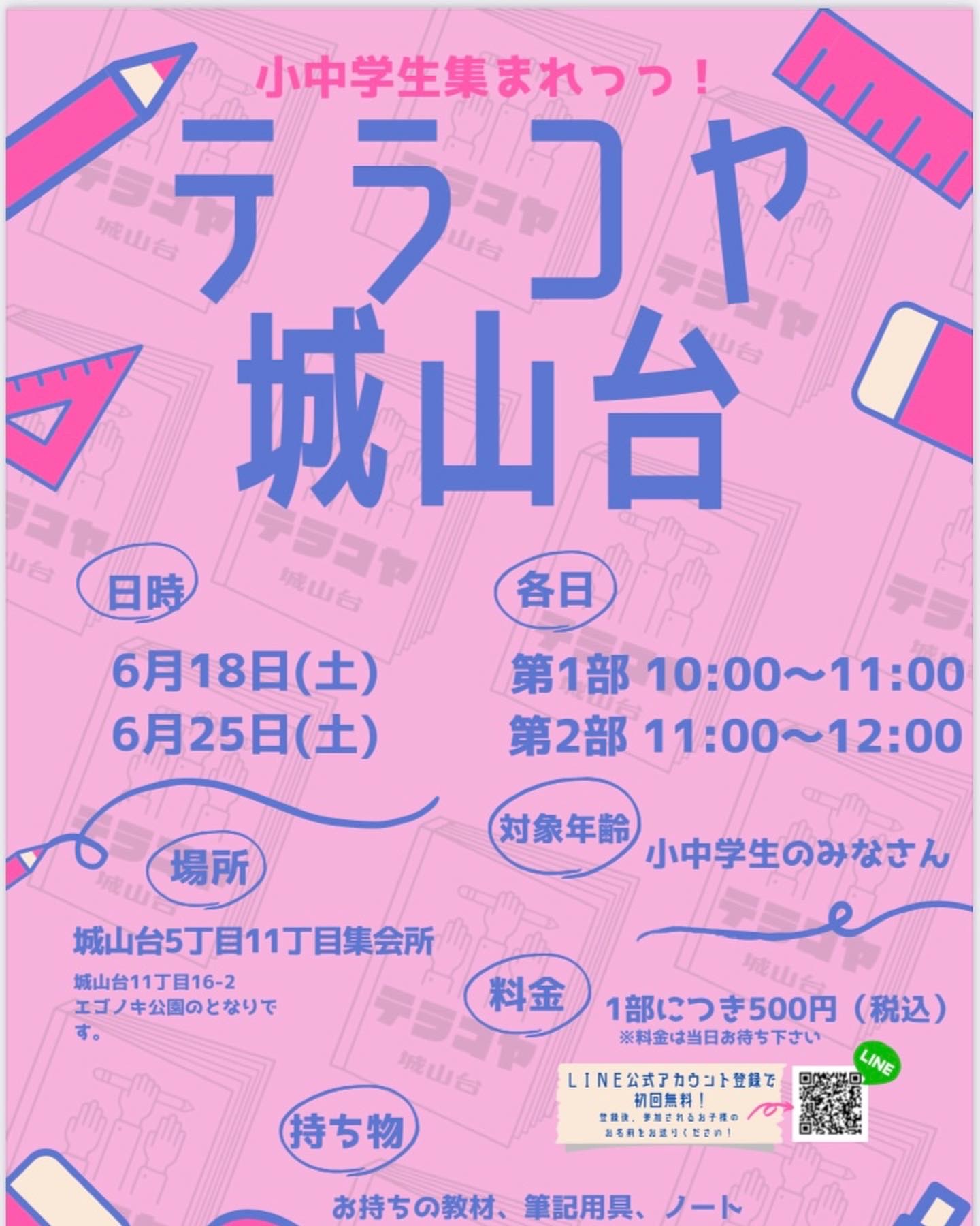 【学習イベントのお知らせ】 皆様 いつもお世話になっております。 今回は久しぶりにテラコヤ城山台を開催することとなりました! 昨年の12月ごろから、地域貢献の一環として「城山台周辺に住む子どもたちの学力向上・学べる場所を … 続きを読む